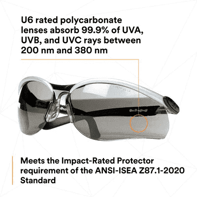 - U6 rated polycarbonate lenses absorb 99.9% of UVA, UVB, and UVC rays between 200 nm and 380 nm.