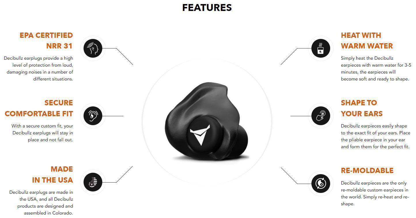 Decibullz Custom Molded Earplugs are easily and quickly fitted to the exact shape of your ear for a NRR of 31dB